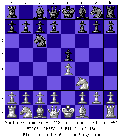 Last move : 0-1 2026 February 17 4:11:35 [Event "FICGS__CHESS__RAPID_D__000160"] [Site "FICGS"] [Date "2025.12.12"] [Round "1"] [White "Martinez Camacho,Victor Hugo"] [Black "Leurette,Marc-Antoine"] [Result "0-1"] [WhiteElo "1371"] [BlackElo "1785"] 1.e4 e5 2.Nf3 Nc6 3.Bb5 a6 4.Ba4 b5 5.Bb3 Bc5 6.O-O Nf6 7.d3 a5 8.a4 b4 9.Ng5 O-O 10.Nxf7 Rxf7 11.Bxf7+ Kxf7 12.Be3 Bd4 13.Bxd4 Nxd4 14.f4 d6 15.fxe5 dxe5 16.c3 bxc3 17.Nxc3 Be6 18.Ne2 Bg4 19.Rf2 Nxe2+ 20.Rxe2 Bxe2 21.Qxe2 Rb8 22.h3 Qd4+ 23.Kh1 Rxb2 24.Qf1 Rd2 25.Rd1 Rxd1 26.Qxd1 c5 27.Qb3+ Kg6 28.Qd1 Nxe4 29.Qg4+ Kf6 30.Qxe4 Qxe4 31.dxe4 c4 32.Kg1 c3 33.Kf2 c2 0-1 Follow this game move after move (download)Fischer is completely natural. He plays no roles. He's like a child. Very, very simple. (Zita Rajcsanyi) Ein Springer auf f6 gegen die eigene Rochadestellung ist schlimmer als ein rostiger Nagel im Knie. (Efim Bogoljubov) El juego de Fischer siempre fue nítido, racional y brillante. Uno de los mejores por siempre. (Dave Regis) Nous sommes les pions de la mystérieuse partie d'Echecs jouée par Dieu. Il nous déplace, nous arrête, nous pousse encore, puis nous lance un à un dans la boîte du Néant. Epitaphe sur la tombe de David Janowsky (1868-1927). I have opinions of my own - strong opinions - but I don't always agree with them. (George Bush)