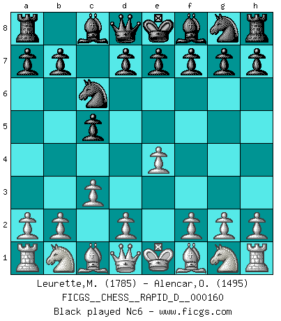 Last move : 1-0 2025 December 25 12:50:43 [Event "FICGS__CHESS__RAPID_D__000160"] [Site "FICGS"] [Date "2025.12.12"] [Round "1"] [White "Leurette,Marc-Antoine"] [Black "Alencar,Ofir"] [Result "1-0"] [WhiteElo "1785"] [BlackElo "1495"] 1.e4 c5 2.c3 Nc6 3.Nf3 d5 4.e5 e6 5.d4 cxd4 6.cxd4 Bb4+ 7.Bd2 Bxd2+ 8.Nbxd2 f6 9.Bb5 a6 10.Bxc6+ bxc6 11.Nb3 f5 12.O-O Ne7 13.Nc5 h6 14.a3 Rb8 15.b4 1-0 Follow this game move after move (download)If I win a tournament, I win it by myself. I do the playing. Nobody helps me. (Bobby Fischer) Die meiste Zeit treffe ich auf Gegner, die meine Enkel sein könnten. Ich bin da, um ihnen zu zeigen, dass sie von mir noch einiges lernen können. (Viktor Kortschnoi) El juego de Damas es para vagabundos. (Paul Morphy) Il vaut mieux sacrifier les pièces de l'adversaire. (Xavier Tartacover) Children in the dark cause accidents, accidents in the dark cause children. (Unknown)