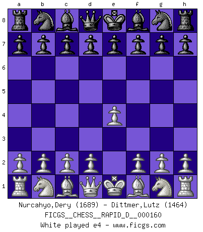Last move : 1-0 2026 January 27 3:30:39 [Event "FICGS__CHESS__RAPID_D__000160"] [Site "FICGS"] [Date "2025.12.12"] [Round "1"] [White "Nurcahyo,Dery"] [Black "Dittmer,Lutz"] [Result "1-0"] [WhiteElo "1689"] [BlackElo "1464"] 1.e4 Nc6 2.c3 d6 3.d4 e5 4.d5 Nb8 5.Nf3 Bg4 6.h3 Bh5 7.Qa4+ 1-0 This chess game has been lost on time (started : 2025.12.12 21:51:51) Follow this game move after move (download)Though most people love to look at the games of the great attacking masters, some of the most successful players in history have been the quiet positional players. They slowly grind you down by taking away your space, tying up your pieces, and leaving you with virtually nothing to do ! (Yasser Seirawan) Wenn du nicht weißt was du tun sollst, warte bis dein Gegner eine Idee hat. Sie wird sicher schlecht sein. (Siegbert Tarrasch) Los Peones son nacidos libres, y aún así, se encuentran por doquier encadenados. (Rick Kennedy) Les échecs sont un jeu terrible. Si vous n'avez pas le centre, votre adversaire a une position plus libre. Par contre, si vous avez le centre, alors vous avez vraiment quelque chose pour laquelle vous inquiéter ! (Siegbert Tarrasch) The man who strikes first admits that his ideas have given out. (Chinese proverb)