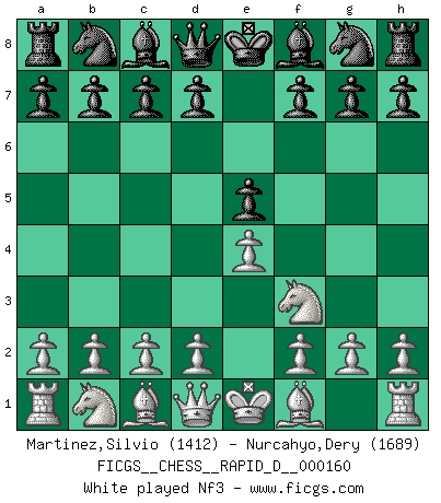Last move : Bd6 2026 January 20 0:2:54 White clock - 10 days 13:09:53 Black clock - 25 days 22:05:06 [Event "FICGS__CHESS__RAPID_D__000160"] [Site "FICGS"] [Date "2025.12.12"] [Round "1"] [White "Martinez,Silvio"] [Black "Nurcahyo,Dery"] [Result "*"] [WhiteElo "1412"] [BlackElo "1689"] 1.e4 e5 2.Nf3 f6 3.Nc3 c6 4.Bc4 Bb4 5.a3 Bc5 6.O-O Ne7 7.d4 exd4 8.Nxd4 d5 9.Bb3 O-O 10.Be3 Na6 11.h3 Kh8 12.Na4 Bd6 13.* Follow this game move after move (download)War is the child of passion, passion is the child of narcissism and narcissism is the child. (...) Another game ? (Thibault de Vassal) Wenn Spassky eine Figur opfert kannst du genauso gut aufgeben. Aber wenn Tal eine Figur opfert, spiel weiter. Er könnte noch eine weitere opfern, und dann ... wer weiß? (Miguel Najdorf) El Ajedrez hace al hombre ser mas sabio y ver mas claro. (Vladimir Putin) Les échecs sont utiles à l'exercice de la faculté de penser et à celle de l'imagination. Car nous devons posséder une méthode élaborée pour atteindre des buts partout où nous devons conduire notre raison. (Leibnitz) No man has ever achieved immortality in his own life time. (Unknown)