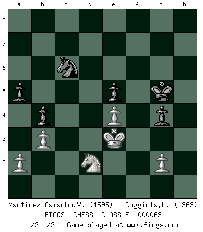 Last move : 1/2-1/2 2007 December 24 0:47:14 [Event "FICGS__CHESS__CLASS_E__000063"] [Site "FICGS"] [Date "2007.10.11"] [Round "1"] [White "Martinez Camacho,Victor Hugo"] [Black "Coggiola,Leandro Damian"] [Result "1/2-1/2"] [WhiteElo "1595"] [BlackElo "1363"] 1.e4 c5 2.f4 Nc6 3.Nc3 e5 4.Bc4 Nf6 5.d3 Be7 6.Nf3 d6 7.O-O O-O 8.fxe5 dxe5 9.Bg5 h6 10.Bxf6 Bxf6 11.Nd5 Be7 12.Nxe7+ Qxe7 13.c3 Na5 14.Bd5 Be6 15.Bxe6 Qxe6 16.Qe2 Nc6 17.b3 Rad8 18.Rad1 Rd7 19.Rd2 Rfd8 20.Rfd1 f5 21.exf5 Qxf5 22.Qe4 Qxe4 23.dxe4 Rxd2 24.Rxd2 Rxd2 25.Nxd2 Kf7 26.Kf2 Kf6 27.Nc4 b5 28.Ne3 a5 29.Nd5+ Kf7 30.Nc7 b4 31.cxb4 cxb4 32.Nd5 Ke6 33.Ke3 Nd4 34.Kd3 g5 35.Ne3 h5 36.Nc4 Nc6 37.Ke3 g4 38.h3 Kf6 39.hxg4 hxg4 40.Nd2 Kg5 1/2-1/2 Sicilian : Grand Prix attack Kingside Castling by player White (move 7) Kingside Castling by player Black (move 7) This chess game ended in a draw. Follow this game move after move (download)The Chess pieces are the block alphabet which shapes thoughts; and these thoughts, although making a visual design on the chessboard, express their beauty abstractly, like a poem. (Marcel Duchamp) Aljechin war kein Nazi. Er war ein Opportunist. Ein schrecklicher Mann. Er liebte Geld über alles und würde für Geld ein Jude, ein Katolik oder ein Protestant werden. (Miguel Najdorf) Preferería tener un Peón que un dedo. (Reuben Fine) Toutes les manuvres exécutées sur une colonne ouverte ont pour but ultime l'intrusion définitive sur la septième ou la huitième rangée, en plein cur de la position ennemie. (Aaron Nimzovitch) Those who make the worst use of their time are the first to complain of its brevity. (Jean de la Bruyere)
