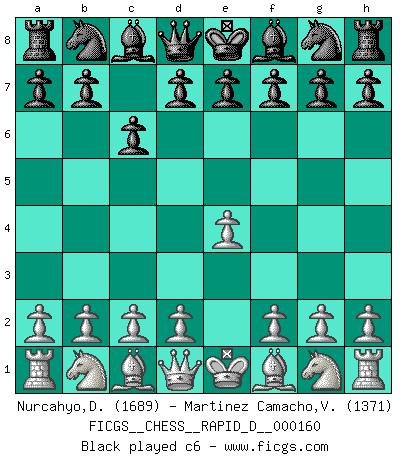 Last move : Rxf2 2026 March 14 21:54:31 White clock - 17 days 16:14:01 Black clock - 1 day 17:08:34 [Event "FICGS__CHESS__RAPID_D__000160"] [Site "FICGS"] [Date "2025.12.12"] [Round "1"] [White "Nurcahyo,Dery"] [Black "Martinez Camacho,Victor Hugo"] [Result "*"] [WhiteElo "1689"] [BlackElo "1371"] 1.e4 c6 2.d4 d5 3.e5 Bf5 4.Nc3 e6 5.Nf3 Bb4 6.Bd2 Ne7 7.Bd3 Bxd3 8.cxd3 Nd7 9.O-O O-O 10.a3 Ba5 11.b4 Bb6 12.Be3 Nf5 13.g4 Nxe3 14.fxe3 f6 15.exf6 Rxf6 16.Kg2 Rh6 17.Qe1 Nf6 18.g5 Rg6 19.h4 Nh5 20.Ne5 Rxg5+ 21.hxg5 Qxg5+ 22.Kf2 Rf8+ 23.Nf3 Qg3+ 24.Ke2 Qg2+ 25.Qf2 Ng3+ 26.Ke1 Qxf2+ 27.Rxf2 * Follow this game move after move (download)All Chess players should have a hobby. (Savielly Tartakower) Wenn Du einsam bist, wenn Du Dich in der Welt wie ein Fremder fühlst, spiele Schach. Das wird Deinen Geist erheben und Dein Ratgeber im Kampf sein. (Aristoteles) Por tratar de evitar la pérdida de una pieza, muchas personas han perdido una partida de Ajedrez. (Savielly Tartakover) Votre seul travail dans les ouvertures est d'obtenir un milieu de partie jouable. (Lajos Portish) Macintosh - we might not get everything right, but at least we knew the century was going to end. (Douglas Adams)