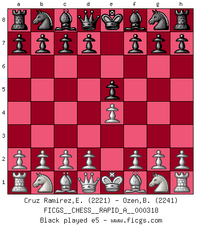 Last move : Nc3 2026 January 19 15:16:47 White clock - 18 days 09:05:15 Black clock - 30 days 06:21:05 [Event "FICGS__CHESS__RAPID_A__000318"] [Site "FICGS"] [Date "2025.12.15"] [Round "1"] [White "Cruz Ramirez,Eliecer"] [Black "Ozen,Bahadir"] [Result "*"] [WhiteElo "2221"] [BlackElo "2241"] 1.e4 e5 2.Nf3 Nf6 3.Nxe5 d6 4.Nf3 Nxe4 5.d4 d5 6.Bd3 Bd6 7.O-O O-O 8.c4 c6 9.Re1 Bf5 10.Ng5 Re8 11.Bxe4 dxe4 12.Nc3 * Follow this game move after move (download)It is difficult to play against Einstein's theory --on his first loss to Fischer. (Mikhail Tal) Ich hatte meine größten Erfolge, als ich 47 Jahre alt war. Kasparow war noch nicht mal 42 und hat das Schach schon im Stich gelassen. (Viktor Kortschnoi) Bobby es la celebridad menos entendida y malinterpretada que camina el la faz de esta tierra. (Yasser Seirawan) Le génie consiste à savoir transgresser les règles au moment opportun. (Teichmann) Industry executives and analysts often mistakenly talk about strategy as if it were some kind of chess match. But in chess, you have just two opponents, each with identical resources, and with luck playing a minimal role. The real world is much more like a poker game, with multiple players trying to make the best of whatever hand fortune has dealt them. In our industry, Bill Gates owns the table until someone proves otherwise. (David Moschella, 'Computerworld')