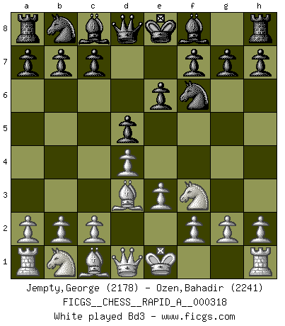 Last move : Rxa8 2026 January 18 16:5:43 George Jempty ... is in vacation until 2026 March 14 22:11:31 White clock - 42 days 02:25:54 Black clock - 21 days 09:38:10 [Event "FICGS__CHESS__RAPID_A__000318"] [Site "FICGS"] [Date "2025.12.15"] [Round "1"] [White "Jempty,George"] [Black "Ozen,Bahadir"] [Result "*"] [WhiteElo "2178"] [BlackElo "2241"] 1.d4 d5 2.Nf3 Nf6 3.e3 e6 4.Bd3 b6 5.c4 Bb7 6.O-O dxc4 7.Bxc4 a6 8.Nc3 b5 9.Bb3 c5 10.e4 cxd4 11.Nxd4 Nbd7 12.Be3 Bb4 13.a4 O-O 14.axb5 axb5 15.Qe2 Qb8 16.Rxa8 * Follow this game move after move (download)The game of Chess is not merely an idle amusement; several very valuable qualities of the mind are to be acquired and strengthened by it, so as to become habits ready on all occasions; for life is a kind of Chess. (Benjamin Franklin) Das ganze Leben mit einer Ehefrau ist wie ein Endspiel mit ungleichfarbigen Läufern. (Viktor Kortschnoi) Botvinnik trató de alejar el misterio referente al Ajedrez, siempre relacionandolo a situaciones de la vida diaria. Solía llamar al Ajedrez un problema inexacto típico, similar a aquellos en que la gente tiene siempre que resolver a cada día. (Garry Kasparov) Il (Jacob Murray) ne joue pas pour le bon coup, mais pour le meilleur. (Eloi Relange) Control your own destiny or someone else will. (Jack Welch)