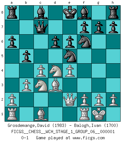 Last move : 0-1 2006 October 17 18:27:0 [Event "FICGS__CHESS__WCH_STAGE_1_GROUP_06__000001"] [Site "FICGS"] [Date "2006.07.01"] [Round "1"] [White "Grosdemange,David"] [Black "Balogh,Ivan"] [Result "0-1"] [WhiteElo "1983"] [BlackElo "1700"] 1.e4 c5 2.Nf3 e6 3.d4 cxd4 4.Nxd4 a6 5.Bd3 Qc7 6.O-O Nf6 7.Qe2 d6 8.c4 Nbd7 9.Nc3 Ne5 10.b3 b5 0-1 This chess game has been lost on time (started : 2006.07.01 16:7:34) Sicilian : Kan, 5.Bd3 Kingside Castling by player White (move 6) Player Black won this chess game. Follow this game move after move (download)The game of Chess is not merely an idle amusement; several very valuable qualities of the mind are to be acquired and strengthened by it, so as to become habits ready on all occasions; for life is a kind of Chess. (Benjamin Franklin) Im Schach gibt es keinen Platz für Galanterie. (Irving Chernev) Botvinnik trataba de restarle el misterio al Ajedrez, siempre relacionandolo a situaciones de la vida ordinaria. El gustaba de llamar al Ajedrez un típico problema inexacto similar a aquellos de los cuales la gente siempre tiene que enfrentarse en la vida cotidiana. (Garry Kasparov) La solitude du joueur d'Echecs à l'approche du mat est semblable à celle du condamné. (Francis Szpiner) All men can see these tactics whereby I conquer, but what none can see is the strategy out of which victory is evolved. (Sun Tzu)