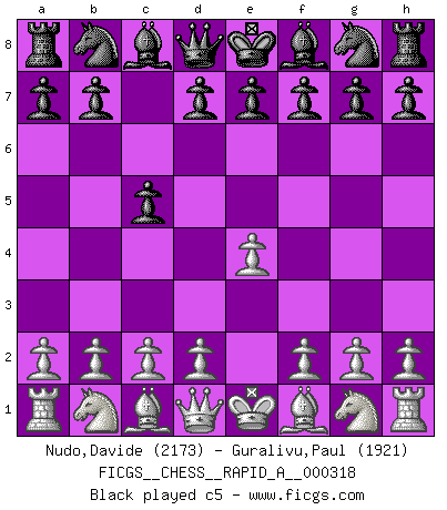 Last move : Rc4 2026 January 30 14:37:16 White clock - 22 days 19:58:55 Black clock - 46 days 12:17:21 [Event "FICGS__CHESS__RAPID_A__000318"] [Site "FICGS"] [Date "2025.12.15"] [Round "1"] [White "Nudo,Davide"] [Black "Guralivu,Paul"] [Result "*"] [WhiteElo "2173"] [BlackElo "1921"] 1.e4 c5 2.Nf3 d6 3.d4 cxd4 4.Nxd4 Nf6 5.Nc3 a6 6.Bc4 e6 7.Bb3 b5 8.Be3 Be7 9.f3 Bd7 10.Qd2 O-O 11.g4 Nc6 12.Nce2 Nxd4 13.Nxd4 b4 14.g5 Ne8 15.Bc4 d5 16.exd5 Nd6 17.Bb3 Qc8 18.dxe6 fxe6 19.Qe2 a5 20.Bd2 a4 21.Bxe6+ Bxe6 22.Qxe6+ Qxe6+ 23.Nxe6 Rxf3 24.Nc7 Rc8 25.Nd5 Bf8 26.O-O-O Ne4 27.Nb6 Rc7 28.Nd5 Rc4 29.* Follow this game move after move (download)Life is like a game of Chess, changing with each move. (Chinese proverb) Schach ist ein Reich, wo sich die menschliche Phantasie frei entfalten kann. (David Bronstein) El Ajedrez lo es todo: arte, ciencia y deporte. (Anatoly Karpov) Aux échecs, l'amour-propre est satisfait quand on remporte la victoire, mais il n'y a pas de honte à être battu. (Benjamin Franklin) Without enthusiasm, virtue functions not at all, and vice only poorly. (Mignon McLaughlin, The Neurotic's Notebook, 1960)