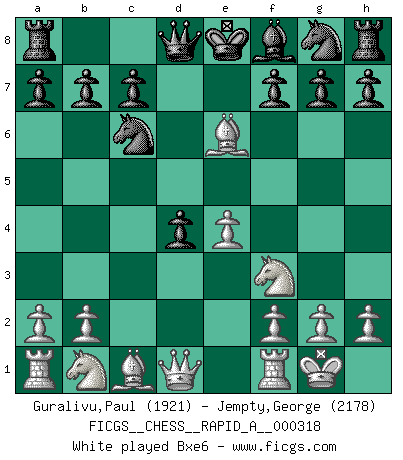 Last move : 1/2-1/2 2026 January 19 15:55:4 [Event "FICGS__CHESS__RAPID_A__000318"] [Site "FICGS"] [Date "2025.12.15"] [Round "1"] [White "Guralivu,Paul"] [Black "Jempty,George"] [Result "1/2-1/2"] [WhiteElo "1921"] [BlackElo "2178"] 1.d4 d5 2.c4 dxc4 3.e4 e5 4.Nf3 exd4 5.Bxc4 Nc6 6.O-O Be6 7.Bxe6 fxe6 8.Qb3 Qd7 9.Qxb7 Rb8 10.Qa6 Nge7 11.Ne1 Ng6 12.f4 Be7 13.g3 O-O 14.Nd2 Nb4 15.Qc4 c5 16.Ndf3 Rfc8 17.a3 Nc6 18.Bd2 Nf8 19.Rc1 Nd8 20.f5 Nf7 21.Bf4 Rxb2 22.Nd3 Rb6 23.a4 a5 24.Nxd4 Rd8 25.fxe6 Nxe6 26.Nxe6 Rxe6 27.Be3 Qc6 28.Rxf7 Rxe4 29.Qa2 Qd5 30.Qxd5 Rxd5 31.Rxe7 Rxe7 32.Nf4 Rf5 33.Bd2 Re4 34.Bxa5 1/2-1/2 Follow this game move after move (download)The enormous mental resilience, without which no Chess player can exist, was so much taken up by Chess that he could never free his mind of this game. (Albert Einstein) Dieses schreckliche Gefühl, dass ich gegen eine Maschine spielte, die niemals Fehler macht, zerschmetterte meinen Widerstand. (Mark Taimanov) Solo los afeminados hacen el Enroque. (Rob Sillars) Le thème de l'attaque double intervient d'une manière ou d'une autre dans l'immense majorité des combinaisons. (Youri Averbakh) Experience is the name we all give to our mistakes. (Oscar Wilde)