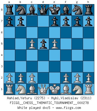 Last move : Ne7 2026 January 29 10:27:10 White clock - 31 days 17:09:20 Black clock - 12 days 07:32:14 [Event "FICGS__CHESS__THEMATIC_TOURNAMENT__000278"] [Site "FICGS"] [Date "2025.12.17"] [Round "1"] [White "Aahlad,Yeturu"] [Black "Hybl,Vladislav"] [Result "*"] [WhiteElo "2275"] [BlackElo "2311"] 1.e4 c6 2.d4 d5 3.e5 c5 4.dxc5 e6 5.Be3 Nd7 6.Bb5 Ne7 7.* Follow this game move after move (download)When you don't know what to do, wait for your opponent to get an idea - it's sure to be wrong. (Tarrasch) Rauchen ist dem Schachspieler bei seiner Arbeit, also im Wettkampf, untersagt. (Viktor Kortschnoi) El Ajedrez lo es todo: arte, ciencia y deporte. (Anatoly Karpov) Un millionnaire : 'Monsieur Steinitz ! Vous ne participez aux tournois que pour l'argent, alors que moi je n'y viens que pour l'honneur.' Steinitz : 'Chacun joue pour ce qu'il n'a pas'... There are two kinds of tragedy in this world, one is not getting what you want and the other is getting. (Lord of war)