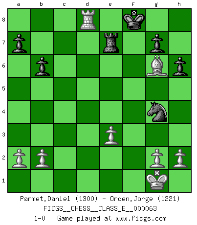 Last move : 1-0 2007 November 17 11:59:22 [Event "FICGS__CHESS__CLASS_E__000063"] [Site "FICGS"] [Date "2007.10.11"] [Round "1"] [White "Parmet,Daniel"] [Black "Orden,Jorge"] [Result "1-0"] [WhiteElo "1300"] [BlackElo "1221"] 1.d4 d5 2.Nf3 Nf6 3.c4 e6 4.Bg5 Be7 5.Nc3 O-O 6.e3 h6 7.Bf4 c5 8.Rc1 Nh5 9.Bxb8 Rxb8 10.cxd5 exd5 11.dxc5 Bxc5 12.Qxd5 Qxd5 13.Nxd5 b6 14.Bc4 Bb7 15.O-O Rbd8 16.Rfd1 Bxd5 17.Bxd5 Nf6 18.Bc4 Ne4 19.Ne5 Kh7 20.Bxf7 Bd6 21.Bg6+ Kg8 22.Nc6 Nxf2 23.Rd4 Rd7 24.Rc2 Rf6 25.Ne7+ Rxe7 26.Rc8+ Rf8 27.Rxf8+ Kxf8 28.Rxd6 Ng4 29.Rd8+ 1-0 Queen's pawn game Kingside Castling by player Black (move 5) Kingside Castling by player White (move 15) Player White won this chess game. Follow this game move after move (download)Your body has to be in top condition. Your Chess deteriorates as your body does. You can't separate body from mind. (Bobby Fischer) Der Bart als Geschlechtszeichen mitten im Gesicht ist obszön. Daher gefällt er den Weibern. [Zugegeben, kein Schachzitat, aber unglaublich originell] (Arthur Schopenhauer) El juego de Damas es para vagabundos. (Paul Morphy) Même un GMI sait rarement calculer sur plus de cinq coups une attaque à sacrifices. (Rudolf Spielmann) Luck never made a man wise. (Seneca, Letters to Lucilius)