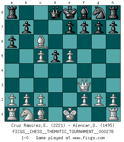 Last move : 1-0 2025 December 30 16:7:31 [Event "FICGS__CHESS__THEMATIC_TOURNAMENT__000278"] [Site "FICGS"] [Date "2025.12.17"] [Round "1"] [White "Cruz Ramirez,Eliecer"] [Black "Alencar,Ofir"] [Result "1-0"] [WhiteElo "2221"] [BlackElo "1495"] 1.e4 c6 2.d4 d5 3.e5 c5 4.Nf3 Bg4 5.dxc5 Bxf3 6.Bb5+ Nc6 7.Qxf3 a6 8.Bxc6+ 1-0 Follow this game move after move (download)The essence of Chess is thinking about what Chess is. (David Bronstein) Kasparov ist eine Art Monster mit hundert Augen, denen auch nicht das Geringste entgeht. (Tony Miles) Durante una competencia de Ajedrez, un Maestro de Ajedrez deberá ser una combinación de presa de caza y un Monge. (Alexander Alekhine) La menace est plus forte que l'exécution. (Aaron Nimzovitch) The real danger is not that computers will begin to think like men, but that men will begin to think like computers. (Sydney J. Harris)
