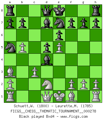 Last move : Bxd4 2026 February 3 11:30:39 White clock - 43 days 00:20:19 Black clock - 77 days 07:20:00 [Event "FICGS__CHESS__THEMATIC_TOURNAMENT__000278"] [Site "FICGS"] [Date "2025.12.17"] [Round "1"] [White "Schuett,Wilhelm"] [Black "Leurette,Marc-Antoine"] [Result "*"] [WhiteElo "1800"] [BlackElo "1785"] 1.e4 c6 2.d4 d5 3.e5 c5 4.dxc5 e6 5.c3 Nc6 6.Nf3 Bxc5 7.b4 Bb6 8.b5 Na5 9.Ba3 Ne7 10.Nbd2 Bd7 11.Nd4 Bxd4 12.* Follow this game move after move (download)Blessed be the memory of him who gave the world this immortal game. (A. G. Gardiner) Ich hatte meine größten Erfolge, als ich 47 Jahre alt war. Kasparow war noch nicht mal 42 und hat das Schach schon im Stich gelassen. (Viktor Kortschnoi) Bobby es la celebridad menos entendida y malinterpretada que camina el la faz de esta tierra. (Yasser Seirawan) Les ravages du H expliquent la différence de niveau entre Tal et Thal [Abergel]. Art is the only way to run away without leaving home. (Twyla Tharp)