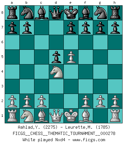 Last move : Nc6 2026 January 23 9:47:15 White clock - 21 days 15:09:17 Black clock - 37 days 20:13:08 [Event "FICGS__CHESS__THEMATIC_TOURNAMENT__000278"] [Site "FICGS"] [Date "2025.12.17"] [Round "1"] [White "Aahlad,Yeturu"] [Black "Leurette,Marc-Antoine"] [Result "*"] [WhiteElo "2275"] [BlackElo "1785"] 1.e4 c6 2.d4 d5 3.e5 c5 4.Nf3 cxd4 5.Nxd4 e6 6.Be3 Nc6 7.f4 Nxd4 8.Bxd4 Ne7 9.Bd3 Nc6 10.* Follow this game move after move (download)Good offense and good defense both begin with good development. (Bruce A. Moon) Im Fernschach kannst du während dem Spiel rauchen. (John Christen Knudsen) Es muy difícil jugar en contra de la teoría de Einstein. - en su primera derrota en contra de Fischer (Mikhail Tal) On est toujours la mazette de quelqu'un d'autre. (Anonyme) For a mechanic, you seem to do an excessive amount of thinking. (C-3PO in Star Wars ep.2)