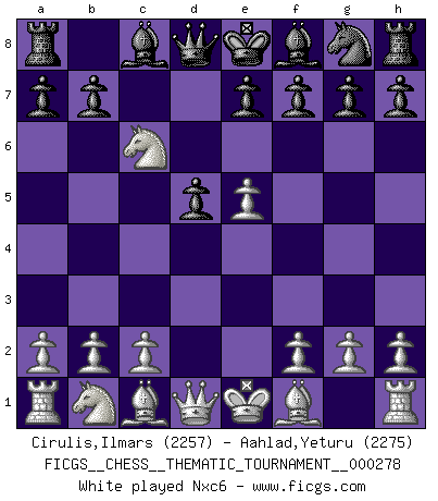 Last move : h5 2026 January 23 19:24:32 White clock - 77 days 20:15:45 Black clock - 61 days 13:39:48 (50 days 08:09:20) [Event "FICGS__CHESS__THEMATIC_TOURNAMENT__000278"] [Site "FICGS"] [Date "2025.12.17"] [Round "1"] [White "Cirulis,Ilmars"] [Black "Aahlad,Yeturu"] [Result "*"] [WhiteElo "2257"] [BlackElo "2275"] 1.e4 c6 2.d4 d5 3.e5 c5 4.Nf3 cxd4 5.Nxd4 Nc6 6.Nxc6 bxc6 7.Bd3 e6 8.Qe2 Bc5 9.h4 a5 10.Nd2 Ne7 11.h5 * Follow this game move after move (download)Chess, like love, like music, has the power to make people happy. (Siegbert Tarrasch) Man braucht nicht immer den besten Zug zu spielen: Ein Zug muß aktiv, unternehmungslustig, korrekt und schön sein. (David Bronstein) El Ajedrez lo es todo: arte, ciencia y deporte. (Anatoly Karpov) J'ai toujours senti une vague pitié pour l'homme qui ne connaît rien aux échecs, tout comme j'en aurais pour un homme ignorant de l'amour. Les Echecs, comme la musique ou comme l'amour, ont le pouvoir de rendre heureux. (Siegbert Tarrasch) Chess is everything: art, science and sport. (Anatoly Karpov)