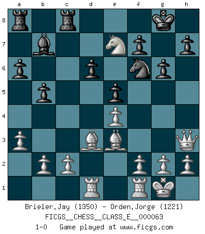 Last move : 1-0 2007 October 19 13:26:49 [Event "FICGS__CHESS__CLASS_E__000063"] [Site "FICGS"] [Date "2007.10.11"] [Round "1"] [White "Brieler,Jay"] [Black "Orden,Jorge"] [Result "1-0"] [WhiteElo "1350"] [BlackElo "1221"] 1.e4 c5 2.Nf3 d6 3.d4 cxd4 4.Nxd4 Nf6 5.Nc3 e6 6.Be3 Be7 7.Bd3 Nc6 8.O-O O-O 9.a3 a6 10.Qe2 b5 11.Nxc6 Qc7 12.Nxe7+ Qxe7 13.Rad1 Bb7 14.Qf3 Rfc8 15.Qh3 e5 16.Nd5 g6 17.Nxe7+ 1-0 Sicilian : Scheveningen variation Kingside Castling by player White (move 8) Kingside Castling by player Black (move 8) Player White won this chess game. Follow this game move after move (download)A sacrifice is best refuted by accepting it. (Wilhelm Steinitz) Schach ist gnadenlos. Du mußt bereit sein zu töten. (Nigel Short) Cada Peón es una Reina en potencia. (James Mason) Dans le domaine de la peinture, de la gravure et de la sculpture, dès la première décennie de notre siècle, les artistes abandonnent la représentation de la partie d'échecs pour se concentrer sur les pièces, sur les échiquiers et sur toutes les variations auxquelles les unes et les autres peuvent donner lieu. On passe en quelque sorte d'un thème social à un thème musical (au sens de la musica médiévale, c'est-à-dire d'une notion qui inclue le rythme, l'harmonie, la construction et la déconstruction, etc.). Graphiquement et picturalement, l'échiquier apparaît comme une structure ouverte, dynamique, d'une richesse infinie, autorisant toutes les combinatoires et débouchant sur des mouvements et des rythmes de nature exponentielle. (Michel Pastoureau) When it is a question of money, everybody is of the same religion. (Voltaire)