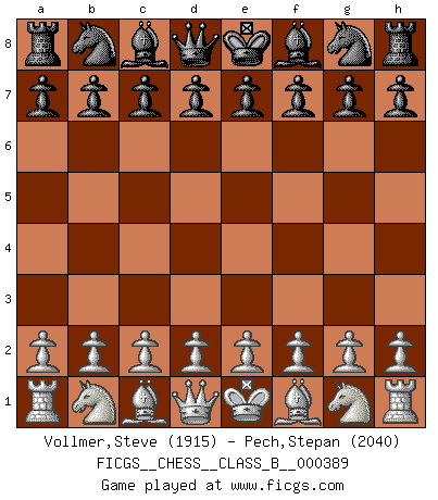 Last move : Nxd4 2026 February 5 9:46:55 White clock - 32 days 14:21:33 Black clock - 8 days 01:21:27 [Event "FICGS__CHESS__CLASS_B__000389"] [Site "FICGS"] [Date "2025.12.22"] [Round "1"] [White "Vollmer,Steve"] [Black "Pech,Stepan"] [Result "*"] [WhiteElo "1915"] [BlackElo "2040"] 1.e4 c5 2.Nf3 e6 3.d4 cxd4 4.Nxd4 * Follow this game move after move (download)I look one move ahead... the best ! (Siegbert Tarrasch) Alles was ich jemals tun will ist Schach spielen. (Robert James Fischer) No es tiempo de jugar al Ajedrez cuando la casa esta en llamas. (Proverbio Italiano) La menace est plus forte que l'exécution. (Aaron Nimzovitch) Mac users swear by their computers. PC users swear at their computers. (Author unknown)