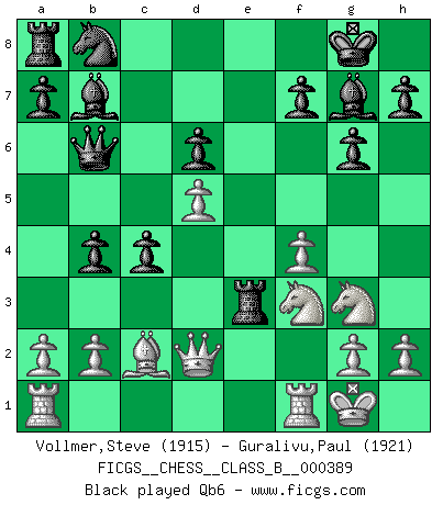 Last move : Qb6 2026 January 24 15:27:42 White clock - 55 days 23:25:12 (47 days 04:31:11) Black clock - 68 days 06:16:46 [Event "FICGS__CHESS__CLASS_B__000389"] [Site "FICGS"] [Date "2025.12.22"] [Round "1"] [White "Vollmer,Steve"] [Black "Guralivu,Paul"] [Result "*"] [WhiteElo "1915"] [BlackElo "1921"] 1.d4 Nf6 2.c4 g6 3.Nc3 Bg7 4.e4 d6 5.f4 O-O 6.Nf3 c5 7.d5 e6 8.Bd3 exd5 9.cxd5 b5 10.O-O c4 11.Bc2 b4 12.Ne2 Re8 13.Ng3 Bb7 14.Be3 Nxd5 15.exd5 Rxe3 16.Qd2 Qb6 17.* Follow this game move after move (download)When you are lonely, when you feel yourself an alien in the world, play Chess. This will raise your spirits and be your counselor in war. (Aristotle) Alles was am Schachbrett zählt sind gute Züge. (Robert James Fischer) El arma más poderosa en el Ajedrez, es tener la próxima movida. (David Bronstein) Les Echecs mettent en conflit, non pas deux intelligences, mais deux volontés. (Lasker) Internal peace cannot coexist with external war. (Don Groves)