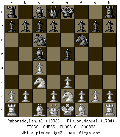 Last move : 1-0 2026 January 8 16:46:8 [Event "FICGS__CHESS__CLASS_C__000332"] [Site "FICGS"] [Date "2025.12.22"] [Round "1"] [White "Reboredo,Daniel"] [Black "Pintor,Manuel"] [Result "1-0"] [WhiteElo "1933"] [BlackElo "1794"] 1.c3 e5 2.c4 Bc5 3.e3 Nc6 4.Nc3 Nf6 5.Nge2 O-O 6.d4 exd4 7.exd4 Bb6 8.Be3 d5 9.c5 Ba5 10.a3 Bxc3+ 11.Nxc3 Re8 12.Be2 Bf5 13.O-O Ne4 14.Nxe4 Bxe4 15.Bd3 Qf6 16.f3 Bg6 17.Bf2 Bh5 18.Kh1 g5 19.Qd2 h6 20.b4 Bg6 21.Bxg6 Qxg6 22.Rfe1 a6 23.h3 Ne7 24.Re2 Nf5 25.Rae1 Rxe2 26.Rxe2 c6 27.Kh2 h5 28.Qc2 Kg7 29.Re5 Nh6 30.Qd2 Nf5 31.g4 hxg4 32.fxg4 Nh4 33.Bxh4 1-0 Follow this game move after move (download)Let the perfectionist play postal. (Yasser Seirawan) Ein typischer, sehr verbreiteter Gedankenschädling ist der, daß der betreffende Amateur von der Annanhme ausgeht, daß jeder einzelne Zug etwas zu leisten habe. (Aaron Nimzowitsch) El ganador de una partida es aquel jugador que hace el penúltimo error. (Savielly Tartakover) Aucun coup ne doit être joué sans but. (Pedro Damiano) An expert is a man who has made all the mistakes which can be made in a very narrow field. (Niels Bohr)