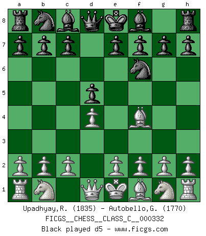 Last move : Bxe4 2026 February 6 2:25:1 White clock - 75 days 10:55:47 Black clock - 38 days 18:50:12 [Event "FICGS__CHESS__CLASS_C__000332"] [Site "FICGS"] [Date "2025.12.22"] [Round "1"] [White "Upadhyay,Rajesh"] [Black "Autobello,Giovanni"] [Result "*"] [WhiteElo "1835"] [BlackElo "1770"] 1.d4 Nf6 2.Bf4 d5 3.e3 c6 4.c4 e6 5.Nc3 Be7 6.h3 O-O 7.Nf3 Nbd7 8.Rc1 a5 9.Bd3 dxc4 10.Bxc4 b5 11.Bd3 Bb7 12.Ne4 Nxe4 13.Bxe4 * Follow this game move after move (download)Chess holds its master in its own bonds, shackling the mind and brain so that the inner freedom of the very strongest must suffer. (Albert Einstein) Kleine Schachspieler machen Mist, und große Schachspieler machen Mist, aber große machen weniger Mist. (Fritz Sämisch) Sin errores no puede haber brillantez. (Emanuel Lasker) A ce moment-là, je menaçais de comprendre la position ! (Clément L'Heureux) Whoever said the pen is mightier than the sword obviously never encountered automatic weapons. (US General Douglas MacArthur)