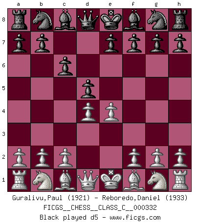 Last move : 1/2-1/2 2026 January 7 14:22:13 [Event "FICGS__CHESS__CLASS_C__000332"] [Site "FICGS"] [Date "2025.12.22"] [Round "1"] [White "Guralivu,Paul"] [Black "Reboredo,Daniel"] [Result "1/2-1/2"] [WhiteElo "1921"] [BlackElo "1933"] 1.e4 c6 2.d4 d5 3.Nc3 dxe4 4.Nxe4 Bf5 5.Ng3 Bg6 6.h4 h6 7.Nf3 Nd7 8.h5 Bh7 9.Bd3 Bxd3 10.Qxd3 e6 11.Bd2 Ngf6 12.O-O-O Be7 13.Ne4 Nxe4 14.Qxe4 Nf6 15.Qe2 Qd5 16.c4 Qe4 17.Qxe4 Nxe4 18.Be3 O-O 1/2-1/2 Follow this game move after move (download)Chess books should be used as we use glasses: to assist the sight, although some players make use of them as if they thought they conferred sight. (Jose Raul Capablanca) Alles was am Schachbrett zählt sind gute Züge. (Robert James Fischer) El arma más poderosa en el Ajedrez, es tener la próxima movida. (David Bronstein) Vouloir jouer aux échecs contre soi-même est aussi paradoxal que vouloir marcher sur son ombre. (Stefan Zweig) It's only after you lost everything, Tyler says, that you're free to do anything. (Chuck Palahniuk, Fight Club)