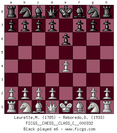 Last move : 0-1 2026 January 4 15:7:56 [Event "FICGS__CHESS__CLASS_C__000332"] [Site "FICGS"] [Date "2025.12.22"] [Round "1"] [White "Leurette,Marc-Antoine"] [Black "Reboredo,Daniel"] [Result "0-1"] [WhiteElo "1785"] [BlackElo "1933"] 1.e4 e6 2.d4 d5 3.e5 c5 4.c3 Nc6 5.Nf3 Bd7 6.Bb5 Nxe5 7.Bxd7+ Nxd7 8.Be3 Qb6 9.b3 Ngf6 10.Nbd2 cxd4 11.Bxd4 Bc5 12.Bxc5 Qxc5 13.c4 O-O 14.O-O Rad8 15.cxd5 Qxd5 16.Nc4 Qxd1 17.Rfxd1 Nc5 18.h3 b6 19.Nfe5 Nfe4 20.Nc6 Ra8 21.Ne7+ Kh8 22.b4 Na6 23.a3 Rfd8 24.Ne5 Rf8 25.Nd7 Rfd8 26.Ne5 Rf8 27.f3 Nf6 28.g4 h6 29.h4 Nc7 30.g5 Nfd5 31.N7c6 Kh7 32.Kf2 Nb5 33.Kg3 Nbc3 34.Re1 h5 35.b5 Nxb5 36.a4 Nd6 37.f4 Nf5+ 0-1 Follow this game move after move (download)The laws of Chess do not permit a free choice: you have to move whether you like it or not. (Emanuel Lasker) Schach ist ein schwarz-weisser Dschungel. (Garry Kasparov) Tu cuerpo tiene que estar en óptima condición. Tu Ajedrez se deteriora como lo hace tu cuerpo. No puedes separar la mente y el cuerpo. (Bobby Fischer) Les Echecs ne sont pas pour les âmes timides. Ils requièrent un homme entier, qui ne s'arrête pas aveuglément à ce qui a été déjà établi, mais qui tente individuellement de sonder les profondeurs du jeu. (W. Steinitz) The greatest con, that he ever pulled... was making you believe... that he is you. (Revolver, movie)