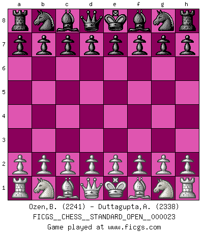 Last move : Qc2 2026 February 1 10:15:0 White clock - 64 days 08:32:26 Black clock - 59 days 13:54:00 (54 days 10:38:29) [Event "FICGS__CHESS__STANDARD_OPEN__000023"] [Site "FICGS"] [Date "2025.12.23"] [Round "2"] [White "Ozen,Bahadir"] [Black "Duttagupta,Aniruddha"] [Result "*"] [WhiteElo "2241"] [BlackElo "2338"] 1.d4 d5 2.c4 e6 3.Nf3 Nf6 4.Nc3 c6 5.Bg5 h6 6.Bh4 dxc4 7.e4 g5 8.Bg3 b5 9.Be2 Bb7 10.h4 g4 11.Ne5 Nbd7 12.Nxd7 Qxd7 13.Be5 Qe7 14.b3 Rg8 15.Qc2 * Follow this game move after move (download)Without error there can be no brilliancy. (Emanuel Lasker) Fischer: 'Remis!?' Uhlmann: 'Aber es muss doch dreimal Zugwiederholung sein!' Fischer: 'Sie nehmen das Remis an, wie ich es sage, sonst spiele ich weiter und werde Sie dann schlagen!' (Robert James Fischer) Uno por uno, yo los acribillé, mi superioridad muy pronto se volvio aparente. (Jose Capablanca) Mais l'homme est une créature légère et illogique : semblable au joueur d'échecs, il n'aime que le processus du but à atteindre, non le but lui-même. (Dostoïevsky) Hold em is to stud what chess is to checkers. (Johnny Moss)