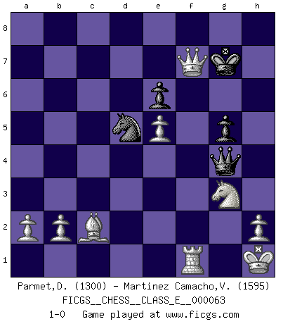 Last move : 1-0 2007 November 19 4:35:17 [Event "FICGS__CHESS__CLASS_E__000063"] [Site "FICGS"] [Date "2007.10.11"] [Round "1"] [White "Parmet,Daniel"] [Black "Martinez Camacho,Victor Hugo"] [Result "1-0"] [WhiteElo "1300"] [BlackElo "1595"] 1.d4 Nf6 2.Nf3 e6 3.c4 d5 4.Bg5 dxc4 5.e4 Be7 6.Nc3 O-O 7.Bxc4 Nbd7 8.O-O h6 9.Bf4 Nb6 10.Bb3 Bd7 11.Rc1 a5 12.Qd3 Bc6 13.Bc2 g6 14.Bxh6 Re8 15.Ne5 Bf8 16.Bxf8 Kxf8 17.Nxc6 bxc6 18.f4 Qd7 19.Na4 Red8 20.Rfd1 Nh5 21.Nc5 Qe7 22.Qf3 Qf6 23.g3 Rxd4 24.e5 Rxd1+ 25.Rxd1 Qe7 26.Qxc6 Nd5 27.Qxa8+ Kg7 28.Qxa5 Nhxf4 29.gxf4 Nxf4 30.Ne4 Qh4 31.Rf1 Qg4+ 32.Ng3 Nh3+ 33.Kg2 Nf4+ 34.Kh1 g5 35.Qxc7 Nd5 36.Qxf7+ 1-0 Queen's pawn game Kingside Castling by player Black (move 6) Kingside Castling by player White (move 8) Player White won this chess game. Follow this game move after move (download)The defensive power of a pinned piece is only imaginary. (Aaron Nimzovich) Je mehr wir mit Computern analysieren, desto mehr glauben wir an Verteidigung. (Vladimir Kramnik) De todos mis libros Rusos, la defensa contiene y difunde el 'calor' mas grande que pudiese verse extraño al observar lo supremamente abstracto que el Ajedrez supuestamente es. (Vladimir Nabokov) Les Echecs ne sont pas pour les âmes timides. Ils requièrent un homme entier, qui ne s'arrête pas aveuglément à ce qui a été déjà établi, mais qui tente individuellement de sonder les profondeurs du jeu. (W. Steinitz) Life is verb, not a noun. (Charlotte Perkins Gilman)