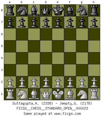 Last move : O-O 2026 February 1 14:30:53 George Jempty ... is in vacation until 2026 March 14 22:11:31 White clock - 47 days 20:28:47 Black clock - 75 days 08:10:51 (54 days 13:21:59) [Event "FICGS__CHESS__STANDARD_OPEN__000023"] [Site "FICGS"] [Date "2025.12.23"] [Round "1"] [White "Duttagupta,Aniruddha"] [Black "Jempty,George"] [Result "*"] [WhiteElo "2338"] [BlackElo "2178"] 1.d4 d5 2.c4 dxc4 3.e4 Nf6 4.e5 Nd5 5.Bxc4 Nb6 6.Bd3 Nc6 7.Be3 Nb4 8.Be4 f5 9.exf6 exf6 10.Nc3 f5 11.Bb1 N4d5 12.Nf3 Nxe3 13.fxe3 Bd6 14.a4 O-O 15.a5 Nd7 16.O-O * Follow this game move after move (download)A passed Pawn increases in strength as the number of pieces on the board diminishes. (Capablanca) Kasparov ist eine Art Monster mit hundert Augen, denen auch nicht das Geringste entgeht. (Tony Miles) Cuando la partida de Ajedrez termina, el Peón y el Rey regresan a la misma caja. (Irish saying) Aucun coup ne doit être joué sans but. (Pedro Damiano) The beginning is the most important part of the work. (Plato)