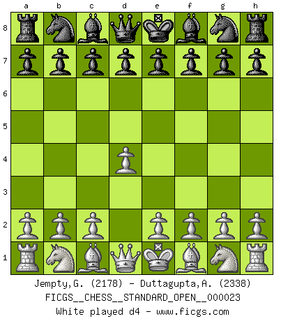 Last move : Qd7 2026 January 27 18:46:47 George Jempty ... is in vacation until 2026 March 14 22:11:31 White clock - 75 days 03:52:58 (49 days 17:40:25) Black clock - 51 days 16:32:02 [Event "FICGS__CHESS__STANDARD_OPEN__000023"] [Site "FICGS"] [Date "2025.12.23"] [Round "2"] [White "Jempty,George"] [Black "Duttagupta,Aniruddha"] [Result "*"] [WhiteElo "2178"] [BlackElo "2338"] 1.d4 d6 2.Nf3 Nf6 3.c4 Nbd7 4.Nc3 e5 5.e4 g6 6.Qc2 Bg7 7.Be2 O-O 8.O-O exd4 9.Nxd4 Nc5 10.Rd1 b6 11.Bg5 Bb7 12.f3 Qd7 13.* Follow this game move after move (download)Adequate compensation for a sacrifice is having a sound combination leading to a winning position; adequate compensation for a blunder is having your opponent snatch defeat from the jaws of victory. (Bruce A. Moon) Kasparov stellt für gewöhnlich die Regeln auf und bricht sie dann selbst wieder. (Alexej Shirov) Al jugar al Ajedrez entonces, podemos aprender: Primero: Previsión... Segundo: Prudencia... Tercero: Cautela... Y al final, aprendemos del Ajedrez el hábito de no ser desanimados por apariencias malas presentes en el estado de nuestros asuntos, el hábito de la esperanza por una oportunidad favorable y la perseveración de los secretos de los recursos. (Benjamin Franklin) A ce moment-là, je menaçais de comprendre la position ! (Clément L'Heureux) All war is based on deception. (Sun Tzu)