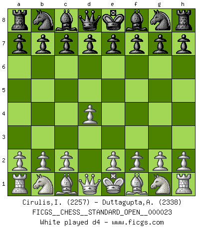 Last move : h4 2026 February 1 15:7:23 White clock - 77 days 08:15:24 Black clock - 38 days 09:01:52 [Event "FICGS__CHESS__STANDARD_OPEN__000023"] [Site "FICGS"] [Date "2025.12.23"] [Round "1"] [White "Cirulis,Ilmars"] [Black "Duttagupta,Aniruddha"] [Result "*"] [WhiteElo "2257"] [BlackElo "2338"] 1.d4 d6 2.c4 e5 3.d5 f5 4.e4 fxe4 5.Ne2 Nf6 6.Ng3 Be7 7.Be3 O-O 8.Be2 a5 9.Nc3 b6 10.a3 Bd7 11.b4 Be8 12.O-O Bg6 13.Qb3 h5 14.h4 * Follow this game move after move (download)After a bad opening, there is hope for the middle game. After a bad middle game, there is hope for the endgame. But once you are in the endgame, the moment of truth has arrived. (Edmar Mednis) Ein Schachspiel besteht aus drei Phasen: Die erste, wenn du hofftst den Vorteil zu haben, die zweite, wenn du glaubst einen Vorteil zu haben, und die dritte.... wenn du weißt Du wirst verlieren. (Savielly Grigorievitsch Tartakower) El Ajedrez se juega con la mente... ¡no con las manos!. (Renaud y Kahn) Les erreurs sont comme les malheurs, elles n'arrivent jamais seules. (Siegbert Tarrasch) Methinks King Thibault should dub Marius Zubac a knight of the square board... I mean table, henceforth addressing him as Sir Marius, and bestow on him a suitable land from the kingdom of FICGS & marry him off to a worthy, fair maiden, lest he slice our heads with his mighty sword in his wrath. (Dinesh De Silva)