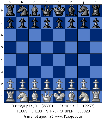 Last move : Be6 2026 January 27 18:34:50 White clock - 38 days 07:03:06 Black clock - 77 days 09:14:47 [Event "FICGS__CHESS__STANDARD_OPEN__000023"] [Site "FICGS"] [Date "2025.12.23"] [Round "2"] [White "Duttagupta,Aniruddha"] [Black "Cirulis,Ilmars"] [Result "*"] [WhiteElo "2338"] [BlackElo "2257"] 1.Nf3 g6 2.c4 Bg7 3.d4 Nf6 4.g3 O-O 5.Bg2 c6 6.Nc3 d5 7.cxd5 cxd5 8.O-O Ne4 9.Bf4 Nc6 10.Ne5 Nxc3 11.bxc3 Nxe5 12.dxe5 Be6 13.* Follow this game move after move (download)The most powerful weapon in Chess is to have the next move. (David Bronstein) Ich bin es gewohnt, das die Jugend mir überhaupt keinen Respekt entgegenbringt. (Alexander Morozewich) Dejen al perfeccionista jugar por correo. (Yasser Seirawan) Même si vous avez un bon coup à faire, regardez toujours s'il n'y en a pas un qui lui soit préférable. (Pedro Damiano) The best teachers teach from the heart, not from the book. (Author unknown)