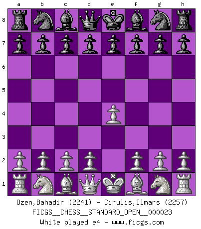 Last move : 1/2-1/2 2026 February 4 15:8:33 [Event "FICGS__CHESS__STANDARD_OPEN__000023"] [Site "FICGS"] [Date "2025.12.23"] [Round "1"] [White "Ozen,Bahadir"] [Black "Cirulis,Ilmars"] [Result "1/2-1/2"] [WhiteElo "2241"] [BlackElo "2257"] 1.e4 c6 2.d4 d5 3.e5 Bf5 4.h4 h5 5.c4 e6 6.Nc3 dxc4 7.Bxc4 Nd7 8.Nge2 Be7 9.g3 Nh6 10.Bf4 Qb6 11.O-O Rd8 12.Qc1 a6 13.Bb3 Ng4 14.Bg5 Bxg5 15.Qxg5 O-O 16.Rae1 Kh7 17.Qxh5+ Nh6 18.Qf3 c5 19.Na4 Qb4 20.Nxc5 1/2-1/2 Follow this game move after move (download)Pawns: they are the soul of this game, they alone form the attack and defense. (Philidor) Schachspieler können ausgezeichnet Varianten am Schachbrett berechnen, aber nicht im realen Leben. Zu stark ist der Individualismus im Schach ausgeprägt, und für viele ist ein kleiner momentaner persönlicher Vorteil wichtiger als ein weit größerer Vorteil von morgen. (Anatoly Karpov) Coloca el contenido de las piezas del Ajedrez en un sombrero, agitalo vigorosamente, arrojalas en un tablero desde una altura de 30 centimetros y así obtendras el estilo de Steinitz. (H. E. Bird) Le profane ne songe pas à la somme de jouissance dont il se prive, qui méconnaît ce jeu aux ressources aussi variées que passionnantes. (Jean-Marie Jeanton-Lamarche) I'll be back. (Arnold Schwarzenegger)