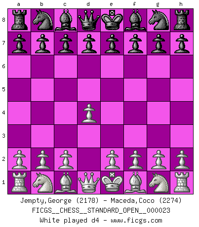 Last move : Qe8 2026 January 30 20:42:23 George Jempty ... is in vacation until 2026 March 14 22:11:31 White clock - 72 days 19:16:25 (52 days 21:08:32) Black clock - 50 days 09:34:49 [Event "FICGS__CHESS__STANDARD_OPEN__000023"] [Site "FICGS"] [Date "2025.12.23"] [Round "2"] [White "Jempty,George"] [Black "Maceda,Coco"] [Result "*"] [WhiteElo "2178"] [BlackElo "2274"] 1.d4 d5 2.Nf3 Nf6 3.e3 e6 4.Bd3 c5 5.b3 b6 6.Bb2 Be7 7.O-O O-O 8.dxc5 Bxc5 9.Nbd2 Bb7 10.Qe2 Nbd7 11.c4 Rc8 12.Rfd1 Qe7 13.cxd5 Nxd5 14.a3 Bd6 15.b4 a5 16.Nc4 Bc7 17.b5 Nc5 18.Bc2 Qe8 19.* Follow this game move after move (download)The most important feature of the Chess position is the activity of the pieces. This is absolutely fundamental in all phases of the game: Opening, Middlegame and especially Endgame. The primary constraint on a piece's activity is the Pawn structure. (Michael Stean) Ein Isolani verdüstert die Stimmung auf dem ganzen Schachbrett. (Savielly Grigorievitsch Tartakower) No hay un Gran Maestro de Ajedrez que sea normal; solo se diferencían ellos por la magnitud de su locura. (Viktor Korchnoi) Dans le domaine de la peinture, de la gravure et de la sculpture, dès la première décennie de notre siècle, les artistes abandonnent la représentation de la partie d'échecs pour se concentrer sur les pièces, sur les échiquiers et sur toutes les variations auxquelles les unes et les autres peuvent donner lieu. On passe en quelque sorte d'un thème social à un thème musical (au sens de la musica médiévale, c'est-à-dire d'une notion qui inclue le rythme, l'harmonie, la construction et la déconstruction, etc.). Graphiquement et picturalement, l'échiquier apparaît comme une structure ouverte, dynamique, d'une richesse infinie, autorisant toutes les combinatoires et débouchant sur des mouvements et des rythmes de nature exponentielle. (Michel Pastoureau) Creativity is inventing, experimenting, growing, taking risks, breaking rules, making mistakes, and having fun. (Mary Lou Cook)