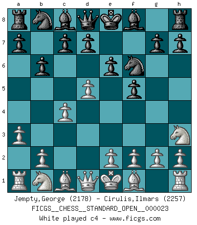Last move : 1/2-1/2 2025 December 30 0:40:10 [Event "FICGS__CHESS__STANDARD_OPEN__000023"] [Site "FICGS"] [Date "2025.12.23"] [Round "1"] [White "Jempty,George"] [Black "Cirulis,Ilmars"] [Result "1/2-1/2"] [WhiteElo "2178"] [BlackElo "2257"] 1.d4 f5 2.Nh3 e6 3.a3 b6 4.d5 Nf6 5.c4 Bd6 6.g3 Bb7 7.Bg2 O-O 8.O-O a5 9.Nc3 Na6 10.Qc2 Nc5 11.Be3 Ng4 12.Bg5 Qe8 13.b4 Ne4 14.Nxe4 fxe4 15.Qxe4 Qh5 16.Bf4 Bxf4 17.gxf4 Nf6 18.Qe5 Qxe5 19.fxe5 Ng4 20.b5 Rae8 21.Rac1 Nxe5 22.Rc3 Ng6 1/2-1/2 Follow this game move after move (download)If I win a tournament, I win it by myself. I do the playing. Nobody helps me. (Bobby Fischer) Ein guter Spieler hat immer Glück. (José Raúl Capablanca) Me dio la sensación de como si yo estuviera jugando en contra del mismo Ajedrez. - al estar jugando en contra de Robert Fischer (Walter Shipman) En blitz, le Cavalier l'emporte sur le Fou. (Vlastimil Hort) Panic is a sudden desertion of us, an a going over to the enemy of our imagination. (Christian Nevell Bovee)