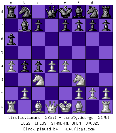 Last move : 1/2-1/2 2025 December 29 19:51:43 [Event "FICGS__CHESS__STANDARD_OPEN__000023"] [Site "FICGS"] [Date "2025.12.23"] [Round "2"] [White "Cirulis,Ilmars"] [Black "Jempty,George"] [Result "1/2-1/2"] [WhiteElo "2257"] [BlackElo "2178"] 1.d4 d5 2.c4 dxc4 3.Nf3 a6 4.e4 b5 5.a4 Bb7 6.Nc3 b4 7.Bxc4 e6 8.Qb3 Nc6 9.a5 Nxd4 10.Nxd4 Qxd4 11.Be3 Qd7 12.Rd1 Qc6 13.Nd5 O-O-O 14.Nxb4 Rxd1+ 15.Kxd1 Qxe4 16.Nxa6 Nf6 17.Kc1 Qc6 18.Nb4 Bxb4 19.Qxb4 Nd5 20.Qb5 Qxb5 21.Bxb5 Nxe3 22.fxe3 Rd8 1/2-1/2 Follow this game move after move (download)Even the laziest King flees wildly in the face of a double check ! (Aaron Nimzowitsch) Strategie ist, wie man ein Mädchen auf den Rücksitz bekommt. Taktik ist, was man tut, wenn man dann dort ist. (Anonymous) Una buena memoria, concentración, imaginación y una fuerte voluntad, se requiere para llegar a ser un buen jugador. (Bobby Fischer) Ce n'est pas pour s'amuser qu'il joue aux échecs : il célèbre un culte. (Vladimir Nabokov) If you are good, you will be assigned all the work. If you are really good, you will get out of it. (Dan Rotaru)