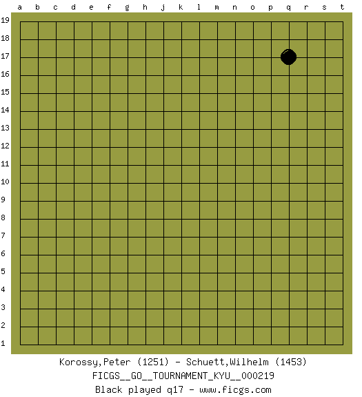 Last move : h5 2026 February 12 15:48:37 Player 1 - 37 days 23:41:22 Player 2 - 35 days 22:10:37 [Event "FICGS__GO__TOURNAMENT_KYU__000219"] [Site "FICGS"] [Date "2025.12.26"] [Round "1"] [Black "Korossy,Peter"] [White "Schuett,Wilhelm"] [Result "*"] [Rating 1 "1251"] [Rating 2 "1453"] 1.q17 q4 2.r15 d16 3.d4 k4 4.g3 k16 5.c14 c15 6.d14 f16 7.d10 q10 8.r12 q8 9.c5 o17 10.k10 m4 11.r3 r4 12.q3 p3 13.p2 o3 14.o2 n3 15.h16 j17 16.h17 g17 17.h18 j18 18.p9 q9 19.p10 q11 20.p11 q12 21.r13 g18 22.h19 d8 23.g8 d6 24.h14 k14 25.g15 c9 26.c10 e5 27.e3 g5 28.h4 h5 29.* Follow this game move after move (download)When in doubt, remove the enemy stones from the board. (Bill Taylor) Gambling is the son of avarice and the father of despair. (French proverb)