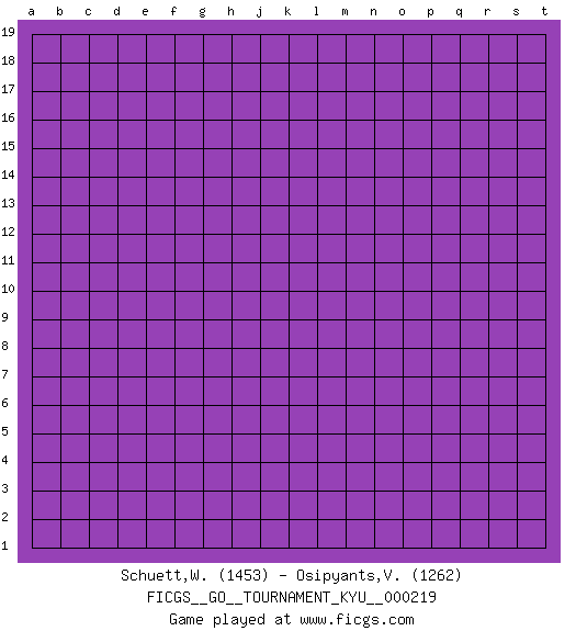 Last move : o15 2026 February 12 16:10:21 Player 1 - 29 days 12:10:04 Player 2 - 53 days 10:08:40 [Event "FICGS__GO__TOURNAMENT_KYU__000219"] [Site "FICGS"] [Date "2025.12.26"] [Round "1"] [Black "Schuett,Wilhelm"] [White "Osipyants,Vladimir"] [Result "*"] [Rating 1 "1453"] [Rating 2 "1262"] 1.q16 q4 2.d4 d17 3.c15 f16 4.c17 d16 5.c16 j16 6.q10 o3 7.d10 k4 8.l16 r17 9.q17 r16 10.r15 s15 11.r14 s14 12.r13 r7 13.h3 j3 14.h4 k7 15.h6 c3 16.c4 d3 17.e3 e2 18.f3 f2 19.g2 b4 20.b5 b3 21.c6 p9 22.j2 k2 23.k17 j17 24.l14 o11 25.p10 o10 26.q9 p8 27.h8 k9 28.r11 s9 29.h10 g14 30.e14 f15 31.f13 g13 32.f12 o13 33.o15 * Follow this game move after move (download)The L-group is dead. (Anonymous) The beginning of wisdom is silence. The second step is listening. (Unknown)