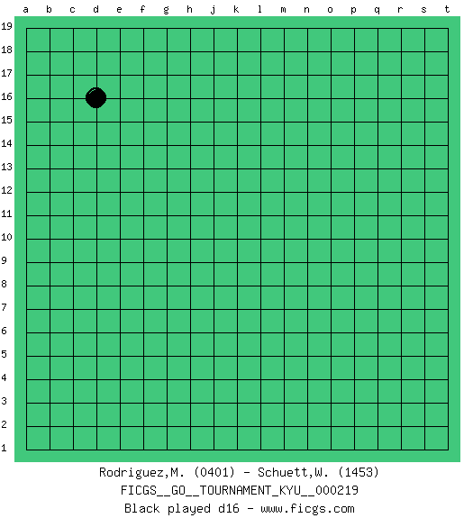 Last move : m2 2026 February 12 19:19:23 Player 1 - 42 days 12:36:57 Player 2 - 33 days 06:33:07 [Event "FICGS__GO__TOURNAMENT_KYU__000219"] [Site "FICGS"] [Date "2025.12.26"] [Round "1"] [Black "Rodriguez,Mariano"] [White "Schuett,Wilhelm"] [Result "*"] [Rating 1 "0401"] [Rating 2 "1453"] 1.d16 d4 2.k16 q16 3.q4 q10 4.d10 k4 5.j4 k3 6.l4 j5 7.k5 h4 8.h5 j3 9.h3 g3 10.l3 h2 11.g4 g5 12.j6 h6 13.g6 f6 14.e6 e5 15.g2 k6 16.d5 d6 17.c6 c5 18.c4 b4 19.a4 c3 20.b5 b6 21.a6 c7 22.j2 k2 23.l2 l5 24.l6 m5 25.m6 n4 26.f3 f4 27.b3 n2 28.d3 d2 29.d1 e3 30.m2 * Follow this game move after move (download)Keep away from thickness. (Anonymous) Creativity is allowing yourself to make mistakes. Art is knowing which ones to keep. (Scott Adams)