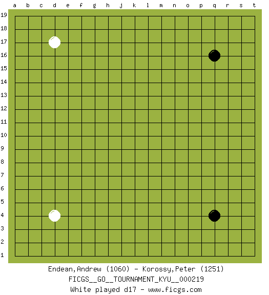 Last move : m5 2026 February 8 22:26:5 Player 1 - 23 days 03:56:57 Player 2 - 36 days 08:47:35 [Event "FICGS__GO__TOURNAMENT_KYU__000219"] [Site "FICGS"] [Date "2025.12.26"] [Round "1"] [Black "Endean,Andrew"] [White "Korossy,Peter"] [Result "*"] [Rating 1 "1060"] [Rating 2 "1251"] 1.q4 d4 2.q16 d17 3.d15 c15 4.d16 c16 5.d13 f17 6.d10 k17 7.k15 q14 8.q10 r17 9.o16 r16 10.q17 r12 11.r8 o3 12.k4 l3 13.k3 g3 14.c3 d3 15.c4 c5 16.d2 e2 17.d1 b2 18.c2 b1 19.b3 b5 20.p3 o4 21.l4 l2 22.k2 o6 23.q6 m5 24.* Follow this game move after move (download)In opponents' sphere of influence, avoid sharp conflict, don't move too deep. (Otake Hideo, 9p) Computers make it easier to do a lot of things, but most of the things they make it easier to do don't need to be done. (Andy Rooney)