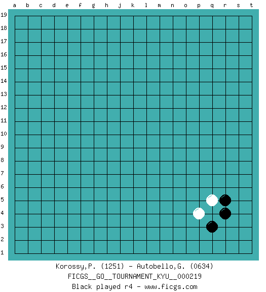 Last move : p9 2026 February 12 7:45:1 Player 1 - 38 days 09:42:28 Player 2 - 4 days 14:33:35 [Event "FICGS__GO__TOURNAMENT_KYU__000219"] [Site "FICGS"] [Date "2025.12.26"] [Round "1"] [Black "Korossy,Peter"] [White "Autobello,Giovanni"] [Result "*"] [Rating 1 "1251"] [Rating 2 "0634"] 1.q3 p4 2.r5 q5 3.r4 p3 4.r7 r6 5.s6 q6 6.r8 q7 7.d4 q2 8.r2 r1 9.p2 q1 10.s1 p1 11.o2 o1 12.n2 q4 13.n1 q8 14.q16 r9 15.q9 q10 16.p9 * Follow this game move after move (download)The L-group is dead. (Anonymous) Men should grow up. - Yeah. And dogs should stop licking themselves. It's not gonna happen. (Gregory House to Dr. Cameron, House M.D.)