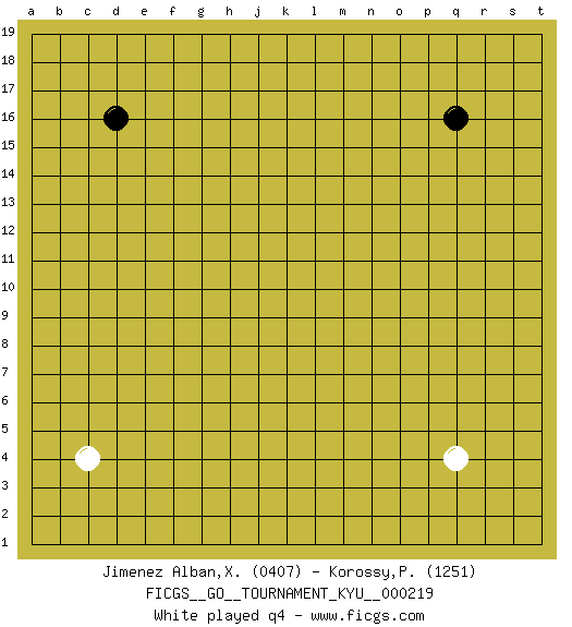 Last move : m4 2026 February 12 16:9:59 Player 1 - 26 days 23:29:33 Player 2 - 43 days 22:59:57 [Event "FICGS__GO__TOURNAMENT_KYU__000219"] [Site "FICGS"] [Date "2025.12.26"] [Round "1"] [Black "Jimenez Alban,Xavier Miguel"] [White "Korossy,Peter"] [Result "*"] [Rating 1 "0407"] [Rating 2 "1251"] 1.q16 c4 2.d16 q4 3.c14 e3 4.q10 k16 5.o17 g16 6.f17 g17 7.f16 m17 8.n16 r6 9.r8 o3 10.q6 q7 11.p6 r7 12.s7 k10 13.d10 c8 14.d8 c7 15.d6 d7 16.e7 e8 17.d9 e6 18.f7 f6 19.g8 g7 20.f8 d5 21.h7 k4 22.n5 q8 23.p9 r9 24.s8 s9 25.s10 r10 26.q9 s11 27.t9 t10 28.j5 k5 29.l4 l5 30.m4 * Follow this game move after move (download)There are players who don't accept exchange: they play many moves that perpetuate a previous state of the game. (Pierre Audouard) No man has ever achieved immortality in his own life time. (Unknown)