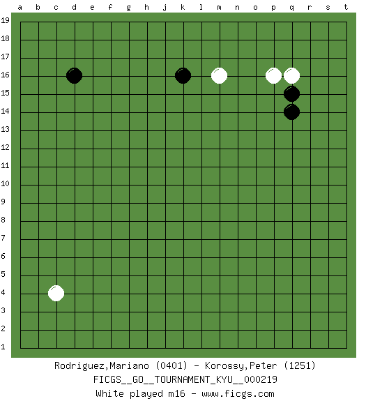 Last move : t8 2026 February 12 19:19:40 Player 1 - 40 days 14:56:54 Player 2 - 46 days 07:33:51 [Event "FICGS__GO__TOURNAMENT_KYU__000219"] [Site "FICGS"] [Date "2025.12.26"] [Round "1"] [Black "Rodriguez,Mariano"] [White "Korossy,Peter"] [Result "*"] [Rating 1 "0401"] [Rating 2 "1251"] 1.d16 c4 2.k16 q16 3.q15 p16 4.q14 m16 5.p15 q4 6.q17 r16 7.o16 o17 8.r17 s16 9.r15 p17 10.p18 o18 11.o19 q18 12.q19 r18 13.t16 s15 14.t15 s14 15.s17 s18 16.t18 n19 17.r19 p19 18.s19 t17 19.r14 s13 20.s12 r12 21.m19 m18 22.t14 s11 23.s10 r10 24.q12 q11 25.q10 p11 26.t13 t12 27.t15 o14 28.n13 o13 29.p13 o15 30.o12 p12 31.t11 s9 32.t10 j4 33.n14 n15 34.m17 l17 35.k17 f17 36.t9 s8 37.s7 r5 38.t8 * Follow this game move after move (download)Dead group ? Always win ko fights ! (Anonymous) Excelling at chess has long been considered a symbol of more general intelligence. That is an incorrect assumption in my view, as pleasant as it might be. But for the purposes of argument and investigation, chess is, in Russkin-Gutman's words, 'an unparalleled laboratory, since both the learning process and the degree of ability obtained can be objectified and quantified, providing an excellent comparative framework on which to use rigorous analytical techniques.' (The Chess Master and the Computer, by Garry Kasparov - 2010)