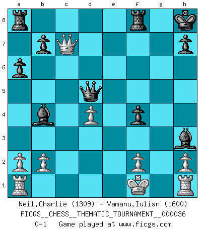 Last move : 0-1 2007 November 20 9:55:33 [Event "FICGS__CHESS__THEMATIC_TOURNAMENT__000036"] [Site "FICGS"] [Date "2007.10.12"] [Round "1"] [White "Neil,Charlie"] [Black "Vamanu,Iulian"] [Result "0-1"] [WhiteElo "1309"] [BlackElo "1600"] 1.e4 e6 2.Nf3 Nc6 3.d4 d5 4.e5 Nge7 5.c3 Nf5 6.Bd3 Be7 7.Nbd2 O-O 8.Nf1 a6 9.Be3 f6 10.Qc2 fxe5 11.dxe5 Kh8 12.Bxf5 exf5 13.Bf4 g5 14.Bd2 g4 15.Ne3 gxf3 16.gxf3 Nxe5 17.Nxd5 Nxf3+ 18.Kf1 Qxd5 19.Be3 f4 20.Bd4+ Nxd4 21.cxd4 Bb4 22.Qxc7 Bh3+ 0-1 French defense Kingside Castling by player Black (move 7) Player Black won this chess game. Follow this game move after move (download)When you see a good move, look for a better one. (Emanuel Lasker) Wenn Capablanka heute auf der Schachbühne erscheinen würde, hätte er ein halbes Jahr gebraucht um sich die Schachtheorie anzueignen. Und dann hätte er alles und jeden besiegt. (Mikhail Moiseyevich Botvinik) Hay dos clases de hombres: aquellos que se conforman en dejarse llevar por las circunstancias y que juegan barajas y aquellos decididos a controlar las circunstancias y que juegan al Ajedrez. (Mortimer Collins) Aidez vos pièces, elles vous aideront. (Paul Morphy) Even the best needles are not sharp at both ends. (Chinese proverb)
