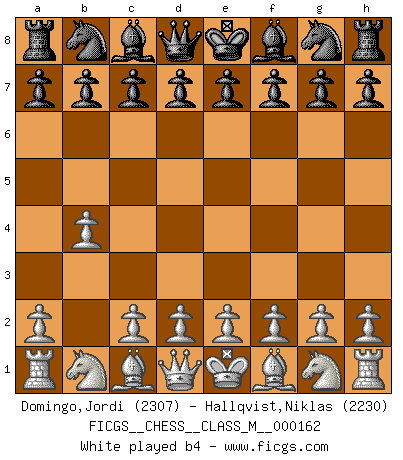 Last move : Bxc4 2026 February 11 19:26:23 White clock - 100 days 00:00:00 Black clock - 97 days 19:12:00 (58 days 18:51:21) [Event "FICGS__CHESS__CLASS_M__000162"] [Site "FICGS"] [Date "2025.12.29"] [Round "1"] [White "Domingo,Jordi"] [Black "Hallqvist,Niklas"] [Result "*"] [WhiteElo "2307"] [BlackElo "2230"] 1.b4 e5 2.Bb2 Bxb4 3.Bxe5 Nf6 4.c3 Be7 5.e3 O-O 6.d4 d5 7.Bd3 Nbd7 8.Bg3 c5 9.Ne2 Nh5 10.Nd2 c4 11.Bc2 Nxg3 12.hxg3 Nf6 13.Rb1 g6 14.O-O Bd6 15.Re1 Rb8 16.e4 dxe4 17.Nxc4 b5 18.Nxd6 Qxd6 19.a4 a6 20.axb5 axb5 21.d5 Bf5 22.Qd4 Rfc8 23.Rb4 Rb6 24.Bb3 h6 25.Ba2 R6b8 26.Bb1 Rb7 27.Ba2 h5 28.Nf4 Kg7 29.Bb3 Qc7 30.Ne2 Qd6 31.Nf4 h4 32.Ne2 h3 33.gxh3 Bxh3 34.Nf4 Bf5 35.Kg2 Qc5 36.Qxc5 Rxc5 37.c4 Bc8 38.Kg1 bxc4 39.Rxc4 Rxc4 40.Bxc4 * Follow this game move after move (download)We don't really know how the game was invented, though there are suspicions. As soon as we discover the culprits, we'll let you know. (Bruce Pandolfini) Ich verstehe mehr vom Schach als irgendein anderer lebender Meister. (José Raúl Capablanca) ¿Esta Bobby Fischer algo cuerdo?. (Salo Flohr) Dans le domaine de la peinture, de la gravure et de la sculpture, dès la première décennie de notre siècle, les artistes abandonnent la représentation de la partie d'échecs pour se concentrer sur les pièces, sur les échiquiers et sur toutes les variations auxquelles les unes et les autres peuvent donner lieu. On passe en quelque sorte d'un thème social à un thème musical (au sens de la musica médiévale, c'est-à-dire d'une notion qui inclue le rythme, l'harmonie, la construction et la déconstruction, etc.). Graphiquement et picturalement, l'échiquier apparaît comme une structure ouverte, dynamique, d'une richesse infinie, autorisant toutes les combinatoires et débouchant sur des mouvements et des rythmes de nature exponentielle. (Michel Pastoureau) The hypothalamus is one of the most important parts of the brain, involved in many kinds of motivation, among other functions. The hypothalamus controls the 'Four Fs: Fighting, Fleeing, Feeding and Mating. (Unknown author)