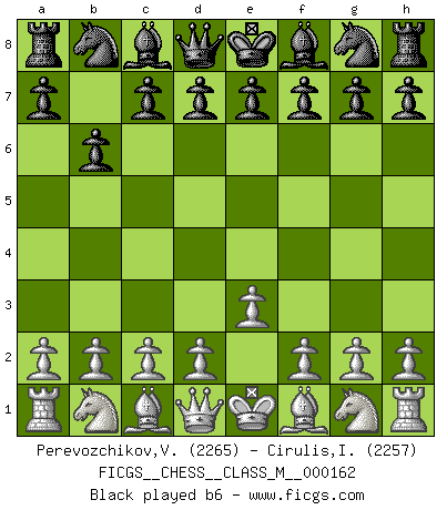 Last move : 1/2-1/2 2026 January 29 12:10:54 [Event "FICGS__CHESS__CLASS_M__000162"] [Site "FICGS"] [Date "2025.12.29"] [Round "1"] [White "Perevozchikov,Vjacheslav"] [Black "Cirulis,Ilmars"] [Result "1/2-1/2"] [WhiteElo "2265"] [BlackElo "2257"] 1.e3 b6 2.c4 Bb7 3.Nc3 e6 4.Nf3 Be7 5.d4 Nf6 6.b3 O-O 7.Bb2 d5 8.Bd3 Nbd7 9.O-O dxc4 10.bxc4 c5 11.Qe2 cxd4 12.exd4 Qc7 13.Rae1 Rfe8 14.Ne5 Nxe5 15.dxe5 Qc6 16.f4 Nd7 17.Rd1 Nc5 18.Bc2 f5 19.Nb5 Red8 20.h3 Rxd1 21.Rxd1 a6 22.Nd6 Rd8 23.Rd2 Qc7 24.Qd1 Bc6 25.Kh2 g6 26.Qe1 h6 27.Qe3 Kh7 28.Bd4 Ba8 29.Rd1 Qc6 30.Qf2 Bxd6 31.exd6 Rxd6 32.Qg3 Rd7 33.Be5 Rxd1 34.Bxd1 Nd7 35.Bf3 Qc8 36.Bxa8 Nxe5 37.fxe5 Qxa8 38.Qd3 Qc8 1/2-1/2 Follow this game move after move (download)My opponents make good moves too. Sometimes I don't take these things into consideration. (Bobby Fischer) Im Reiche der Wirklichkeit ist man nie so glücklich wie im Reiche der Gedanken. (Arthur Schopenhauer) El Ajedrez es tan interesante por sí solo, que no es necesario un interés monetario para persuadir a una persona a que lo practique; por lo tanto, nunca se juega por dinero. (Benjamin Franklin) Les échecs sont plus proches de l'art de l'assassinat que de l'art de la guerre. (Arturo Perez-Reverte) Plans are ideas that never come to fruition. (Daniel Parmet)