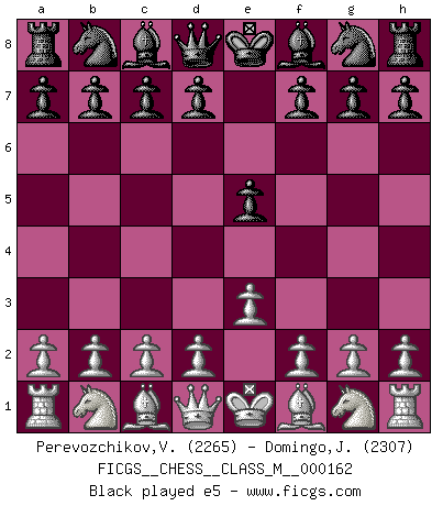 Last move : fxg4 2026 February 12 20:51:46 White clock - 93 days 12:02:40 (59 days 20:16:43) Black clock - 99 days 08:22:00 [Event "FICGS__CHESS__CLASS_M__000162"] [Site "FICGS"] [Date "2025.12.29"] [Round "1"] [White "Perevozchikov,Vjacheslav"] [Black "Domingo,Jordi"] [Result "*"] [WhiteElo "2265"] [BlackElo "2307"] 1.e3 e5 2.Nf3 e4 3.Nd4 c5 4.Ne2 d5 5.c4 d4 6.d3 exd3 7.Ng3 Nc6 8.Bxd3 Be6 9.O-O Nf6 10.Re1 dxe3 11.Bxe3 Nb4 12.Qa4+ Qd7 13.Bc2 O-O-O 14.Qb3 Ng4 15.Rd1 Qe7 16.Nc3 Nxe3 17.fxe3 g6 18.Be4 f5 19.Bxb7+ Kxb7 20.a3 Rxd1+ 21.Rxd1 Bh6 22.Nf1 a5 23.axb4 cxb4 24.Qa4 Qc5 25.Nb5 Bxe3+ 26.Nxe3 Rd8 27.h3 Qxe3+ 28.Kh1 Rxd1+ 29.Qxd1 g5 30.Qd8 Qc1+ 31.Kh2 Qf4+ 32.g3 Qf2+ 33.Kh1 Qf3+ 34.Kh2 Qf2+ 35.Kh1 Qb6 36.Qe7+ Kb8 37.Qe8+ Bc8 38.Qe5+ Ka8 39.Kg2 a4 40.Nd6 Ba6 41.c5 Qc6+ 42.Kf2 g4 43.hxg4 fxg4 44.* Follow this game move after move (download)Man is a frivolous, a specious creature, and like a Chess player, cares more for the process of attaining his goal than for the goal itself. (Dostoyevsky) Ich trinke, ich rauche, ich spiele, ich liebe Frauen aber Fernschach ist ein Laster, das ich nicht habe. (Mikhail Nekhemyevich Tal) El Ajedrez es una manera fabulosa para que los niños aprendan a autovalorarse y a autoestimarse. (Saudin Robovic) Je crois qu'il existe des manières très spécifiques de jouer efficacement contre une machine. Evidemment, nous n'avons aucune chance en technique pure, parce que l'ordinateur calcule de manière parfaite. Mais lorsque nous faisons appel à notre cerveau, en utilisant l'intuition et la compréhension, alors nous restons beaucoup plus forts. (Anatoli Karpov) CHESS, n. f. [echecs, Fr.] A nice and abstruse game, in which two sets of puppets are moved in opposition to each other. (Dr Samuel Johnson, A Dictionary Of The English Language, 1755)