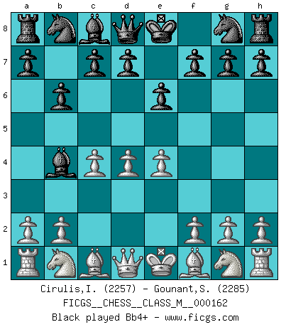 Last move : 1/2-1/2 2026 January 13 21:41:22 [Event "FICGS__CHESS__CLASS_M__000162"] [Site "FICGS"] [Date "2025.12.29"] [Round "1"] [White "Cirulis,Ilmars"] [Black "Gounant,Stanislas"] [Result "1/2-1/2"] [WhiteElo "2257"] [BlackElo "2285"] 1.d4 e6 2.c4 b6 3.e4 Bb4+ 4.Bd2 Bxd2+ 5.Nxd2 Ne7 6.g3 d5 7.Ne2 dxe4 8.Nxe4 Bb7 9.Bg2 Nd7 10.Qc2 Bxe4 11.Qxe4 c6 12.O-O-O O-O 13.Kb1 a6 14.h4 b5 15.Qd3 Nb6 16.c5 Nbd5 17.g4 a5 18.Be4 h6 19.Ng3 a4 20.g5 a3 21.gxh6 axb2 22.hxg7 Re8 23.Qd2 Qa5 24.Qxa5 Rxa5 25.Kxb2 Rea8 26.Bb1 Ra4 27.Rd3 Kxg7 28.h5 Kh6 29.Rf3 Rxd4 30.Rxf7 Rb4+ 31.Kc1 Rc4+ 32.Kd2 Nf5 33.Nxf5+ exf5 34.Rxf5 Rd4+ 35.Ke2 Rb4 36.Kd3 Ra3+ 37.Kd2 Nc3 38.Rf6+ Kg7 39.Rg6+ Kf7 40.Bc2 Rb2 41.Rxc6 Rbxa2 42.Re1 Nd5 43.Kd1 Ra1+ 1/2-1/2 Follow this game move after move (download)The laws of Chess do not permit a free choice: you have to move whether you like it or not. (Emanuel Lasker) Die Fehler sind da, Sie warten nur darauf gemacht zu werden. (Savielly Grigorievitsch Tartakower) Hay dos clases de hombres: aquellos que se conforman en dejarse llevar por las circunstancias y que juegan barajas y aquellos decididos a controlar las circunstancias y que juegan al Ajedrez. (Mortimer Collins) Soyez une menace à chaque fois que vous vous asseyez pour jouer. (Ken Smith) Life is like a game of cards: the hand you are dealt represents determinism; the way you play it is free will. (Jawaharlal Nehru)