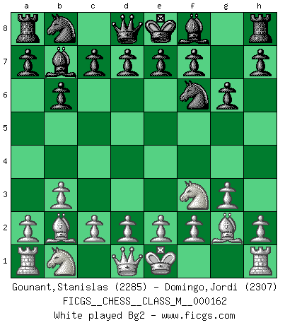 Last move : 1/2-1/2 2026 January 7 22:42:26 [Event "FICGS__CHESS__CLASS_M__000162"] [Site "FICGS"] [Date "2025.12.29"] [Round "1"] [White "Gounant,Stanislas"] [Black "Domingo,Jordi"] [Result "1/2-1/2"] [WhiteElo "2285"] [BlackElo "2307"] 1.b3 Nf6 2.Bb2 b6 3.Nf3 Bb7 4.g3 g6 5.Bg2 Bg7 6.c4 c5 7.d4 O-O 8.dxc5 bxc5 9.O-O e6 10.e3 Qe7 11.Qe2 Rd8 12.Nc3 d6 13.Ne1 Na6 14.Rd1 Nb4 15.Bxb7 Qxb7 16.Na4 h5 17.Bc3 Rac8 18.Ng2 Qc7 19.Nh4 Qb7 20.Ng2 Qc7 21.Qb2 Qe7 22.e4 1/2-1/2 Follow this game move after move (download)Chess opens and enriches your mind. (Saudin Robovic) Es gibt nur zwei wahre Schachgenies - das andere war Wilhelm Steinitz, der Weltmeister von 1872 bis 1894. (Robert James Fischer) El Ajedrez es realmente noventa y nueve por ciento calculación. (Soltis) C'est une question de caractère, Beaucoup de gens perdent leur motivation très vite. D'autres, ils sont rares, peuvent la conserver très longtemps. J'aime les échecs, encore aujourd'hui je suis heureux d'analyser des parties. J'aime toujours gagner, je déteste encore perdre. Bien jouer est important pour mon intégrité intellectuelle et morale. Et puis les échecs vivent en ce moment une période historique grâce à Internet. Ils se développent dans les systèmes éducatifs à travers le monde. Ils sortent de leur ghetto, et c'est mon rôle de mener à bien cette révolution. (Gary Kasparov) It's unlucky to be superstitious. (Dave Enteles)