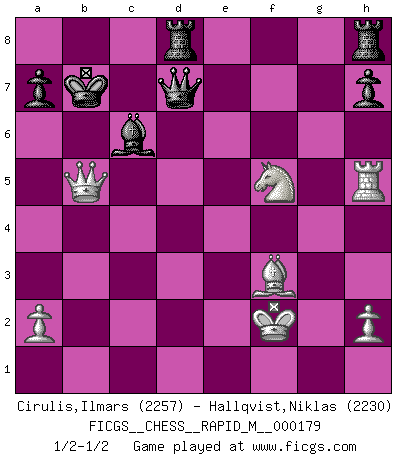 First move 2026 January 2 2:36:44 White clock - 29 days 18:14:14 Black clock - 30 days 00:00:00 [Event "FICGS__CHESS__RAPID_M__000179"] [Site "FICGS"] [Date "2026.01.02"] [Round "1"] [White "Cirulis,Ilmars"] [Black "Hallqvist,Niklas"] [Result "*"] [WhiteElo "2257"] [BlackElo "2230"] 1.* Follow this game move after move (download)I'm not afraid of Spassky. The world knows I'm the best. You don't need a match to prove it. (Bobby Fischer) Sicherlich können nur Meister einen Stil haben. Daß ein nicht-Meister auch nur ein einziges Mal in seinem Leben eine Partie folgerecht durchführte, habe ich niemals bemerkt. (Emanuel Lasker) Un entendimiento minucioso de las típicas continuaciones de mate hacen de las mas complicadas combinaciones de sacrificio que conducen hacia ellas no solo no dificiles, sino casi un asunto de rutina. (Siegbert Tarrasch) Aidez vos pièces, elles vous aideront. (Paul Morphy) There's always a bigger fish. (Qui-Gon Jinn in Star Wars ep.1)