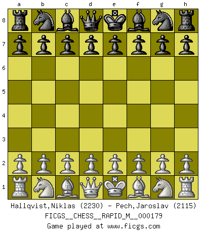 First move 2026 January 2 2:36:44 White clock - 29 days 16:14:10 Black clock - 30 days 00:00:00 [Event "FICGS__CHESS__RAPID_M__000179"] [Site "FICGS"] [Date "2026.01.02"] [Round "1"] [White "Hallqvist,Niklas"] [Black "Pech,Jaroslav"] [Result "*"] [WhiteElo "2230"] [BlackElo "2115"] 1.* Follow this game move after move (download)Alekhine is a poet who creates a work of art out of something that would hardly inspire another man to send home a picture post card. (Max Euwe) Rauchen ist dem Schachspieler bei seiner Arbeit, also im Wettkampf, untersagt. (Viktor Kortschnoi) El Ajedrez demanda una total concentración. (Bobby Fischer) Tout change constamment, y compris dans le monde des Echecs. (Botvinnik) I can't decide which is riskier; taking crazy risks, or taking advice on crazy risks from a crazy risk taker. (Gregory House in House M.D.)
