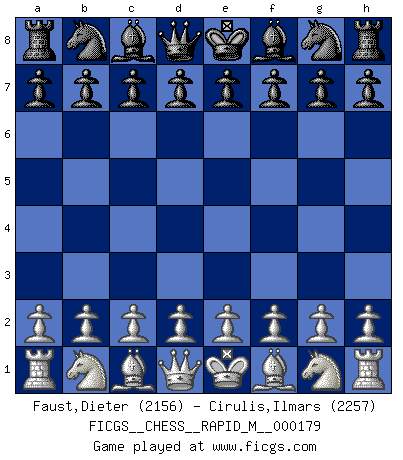 First move 2026 January 2 2:36:44 White clock - 29 days 18:32:59 Black clock - 30 days 00:00:00 [Event "FICGS__CHESS__RAPID_M__000179"] [Site "FICGS"] [Date "2026.01.02"] [Round "1"] [White "Faust,Dieter"] [Black "Cirulis,Ilmars"] [Result "*"] [WhiteElo "2156"] [BlackElo "2257"] 1.* Follow this game move after move (download)That's what Chess is all about. One day you give your opponent a lesson, the next day he gives you one. (Bobby Fischer) Schach sollte überall auf der Welt Schulfach werden. Es fördert die geistige Auseinandersetzung. Es lehrt die Demut in der Niederlage. (Garry Kasparov) En el Ajedrez, cuando menos, el valiente hereda la tierra. (Edmar Mednis) Les Echecs sont affaire de jugement sensible. Savoir quand frapper et quand esquiver. (Fischer) Somehow our devils are never quite what we expect when we meet them face to face. (Nelson DeMille)